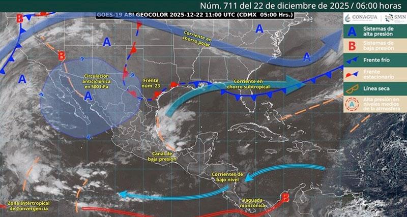 Esto derivado de un canal de baja presión sobre el oriente y sureste de México, el cual se combina con un sistema de alta presión que genera una circulación anticiclónica