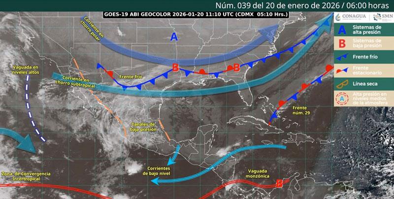 Estas condiciones se deben a que la masa de aire frío que impulsó al frente frío número 29 modificará gradualmente sus características térmicas a lo largo del día.