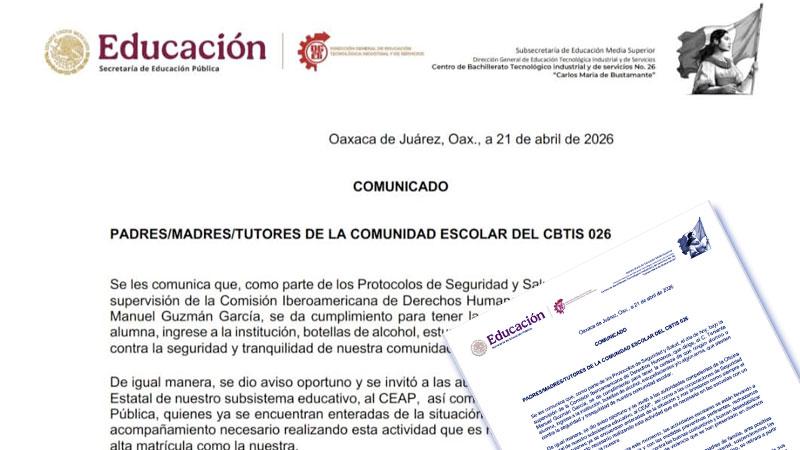 Oaxaca de Juárez, Oax., 21 de abril. — Autoridades educativas del CBTis 26 suspendieron clases este martes tras el hallazgo de un mensaje intimidatorio en el baño de caballeros del plantel, ubicado en San Felipe del Agua, al norte de Oaxaca de Juárez, en el que se hacía referencia a un posible tiroteo.